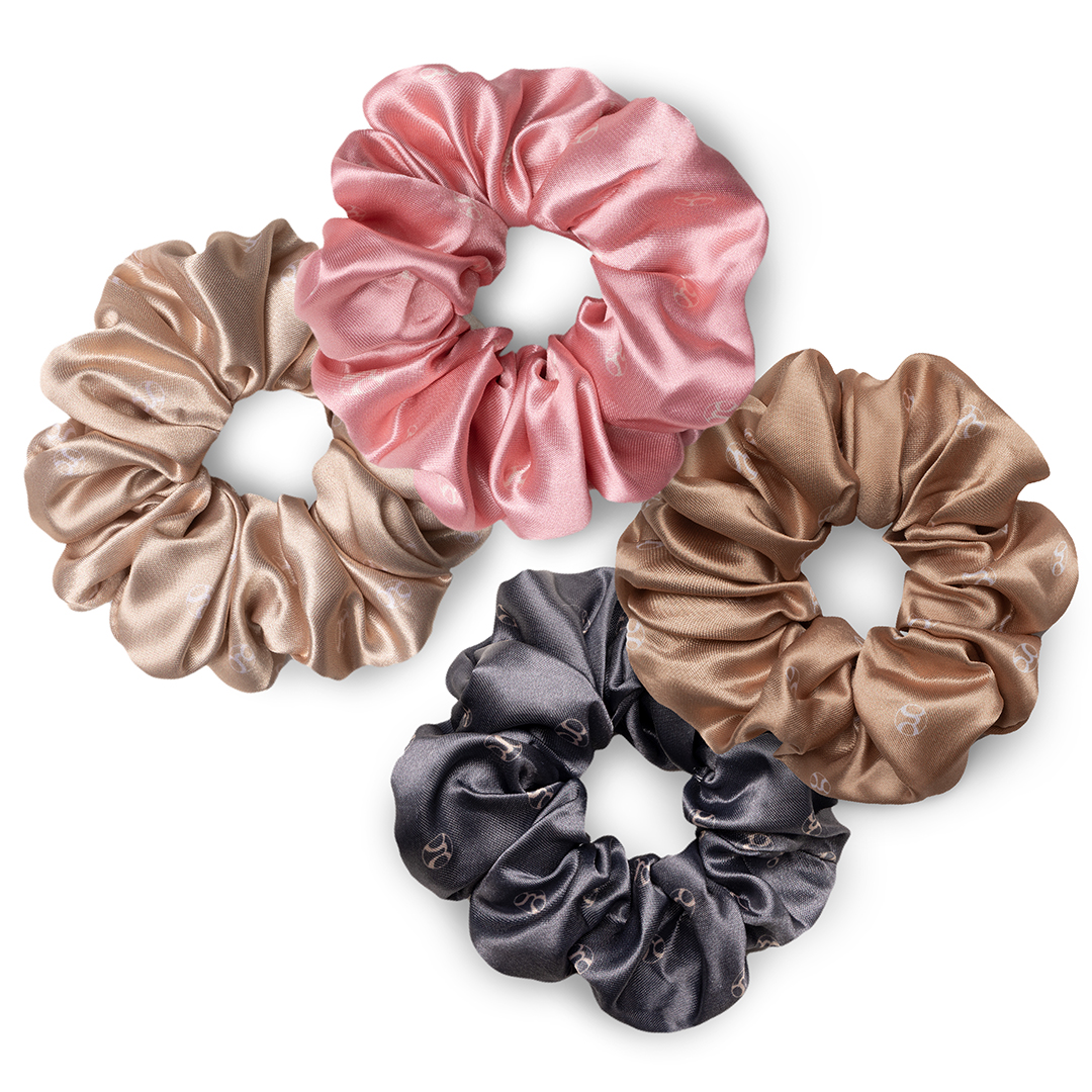 This assorted pack of 4 contains 1 charcoal, 1 pink, 1 rich cream, and 1 golden satin scrunchie.